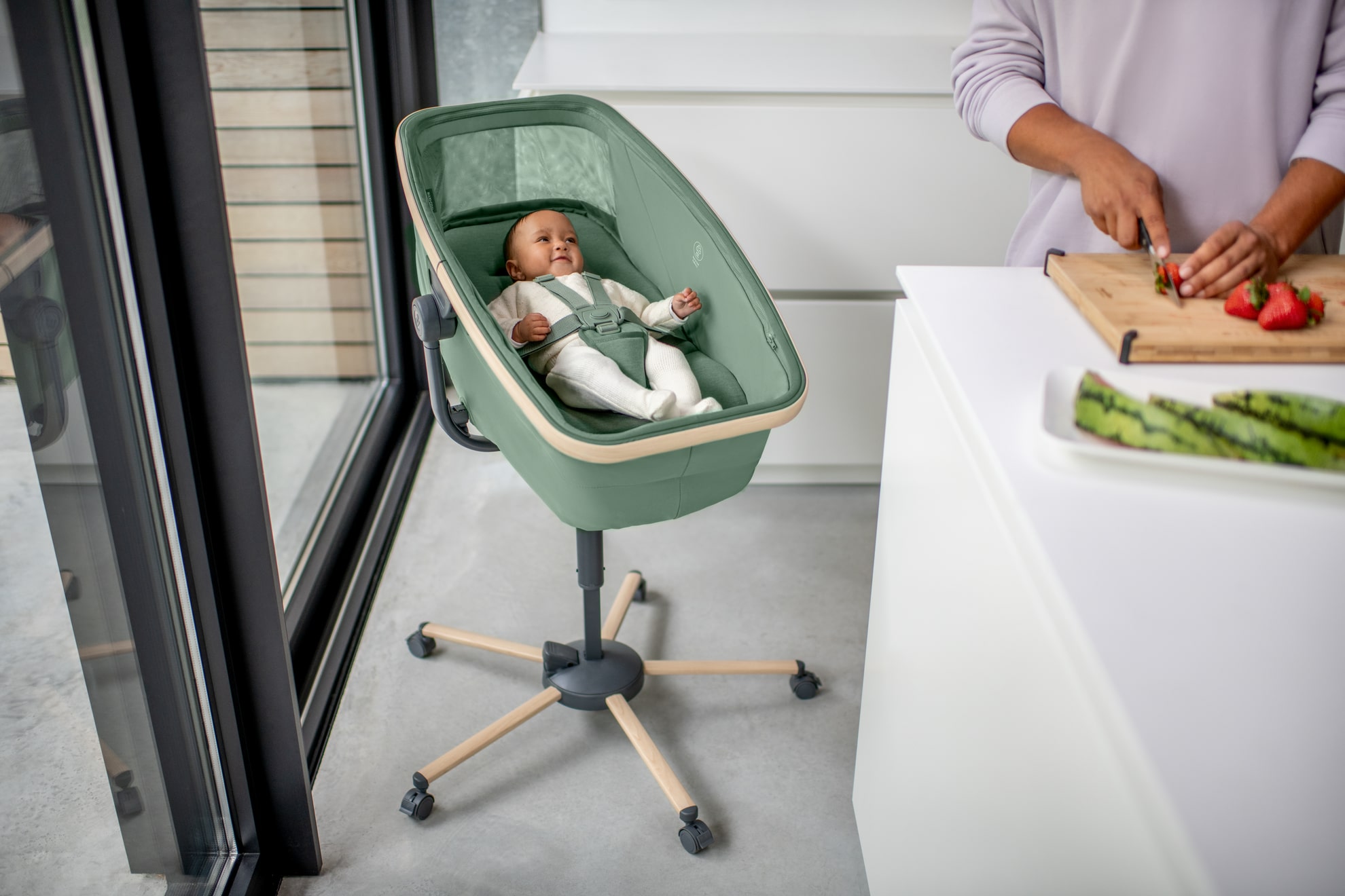 Wenn dein Baby den ganzen Tag an deiner Seite ist, ist es viel einfacher, sich gemeinsam im Haus zu bewegen. Dein Baby kann überall bequem spielen, essen und schlafen, während du in Ruhe deine Arbeit erledigen kannst. Unser Maxi-Cosi Alba ist ein stilvoller Stubenwagen, Liegesessel und Hochstuhl mit Rädern, damit du dein Baby stets in deiner Nähe hast. Er kann ab der Geburt bis zum Alter von 3 Jahren verwendet werden. Der Alba besteht aus superweichen, 100 % recycelten Materialien und verfügt über eine besonders dicke Matratze, damit es dein Baby immer bequem hat.