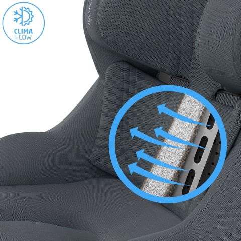 Die ClimaFlow Belüftungspaneele, der atmungsaktive Schaumstoff und die Mesh-Stoffe des Kindersitzes verbessern die Luftzirkulation und bieten deinem Kind das ganze Jahr hindurch Komfort.